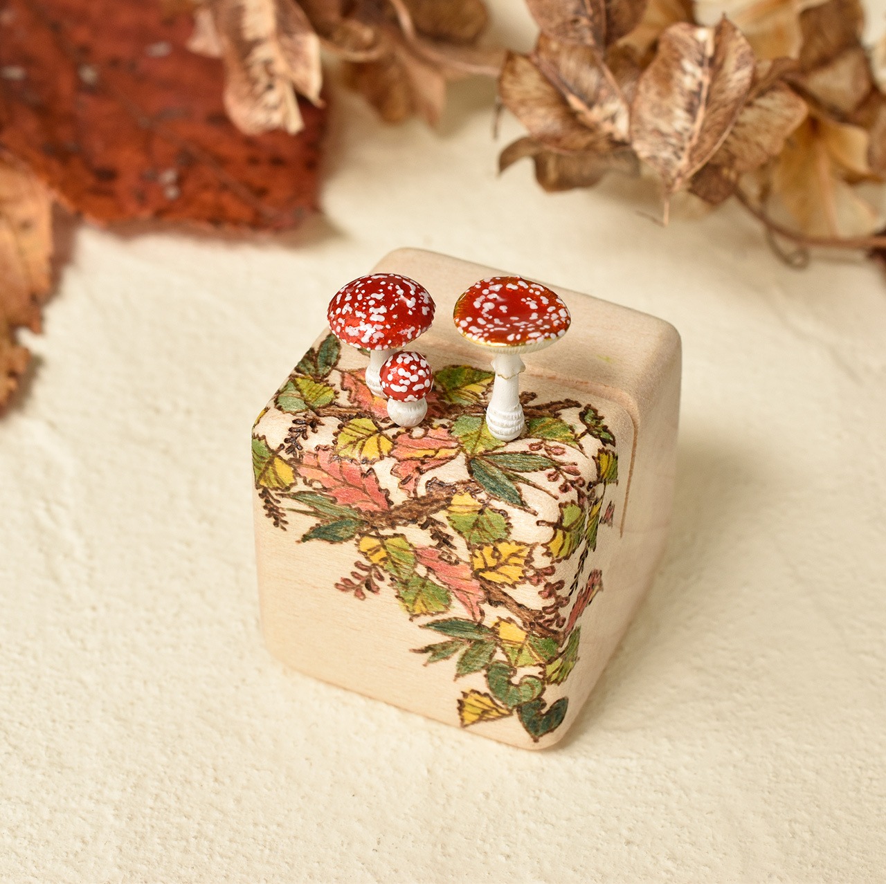 構図や色味はひとつひとつ違います。それぞれのきのこが発生する環境を意識した絵柄を入れています。