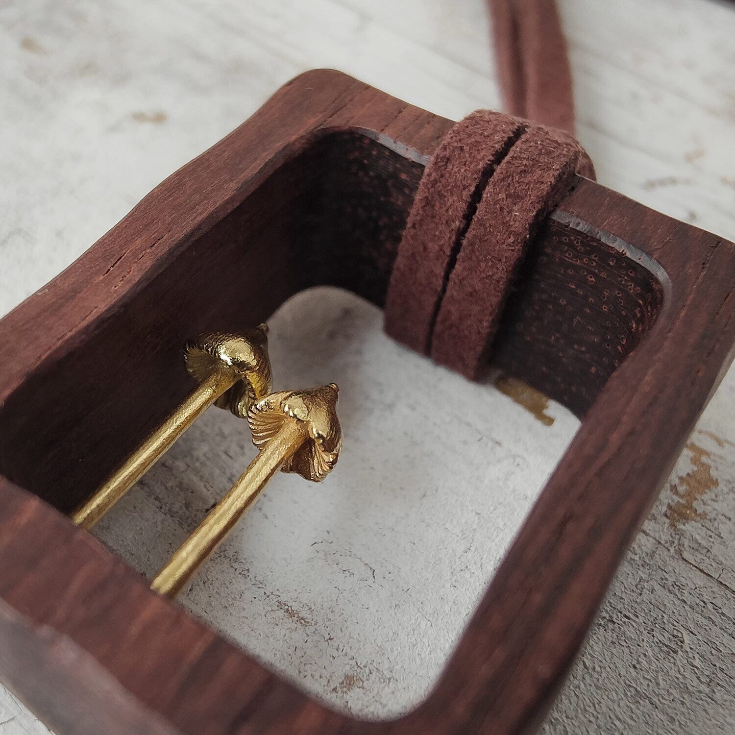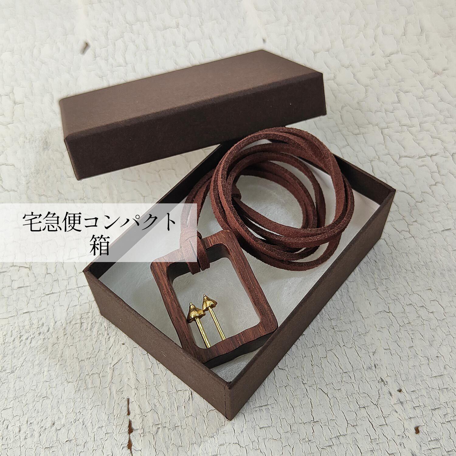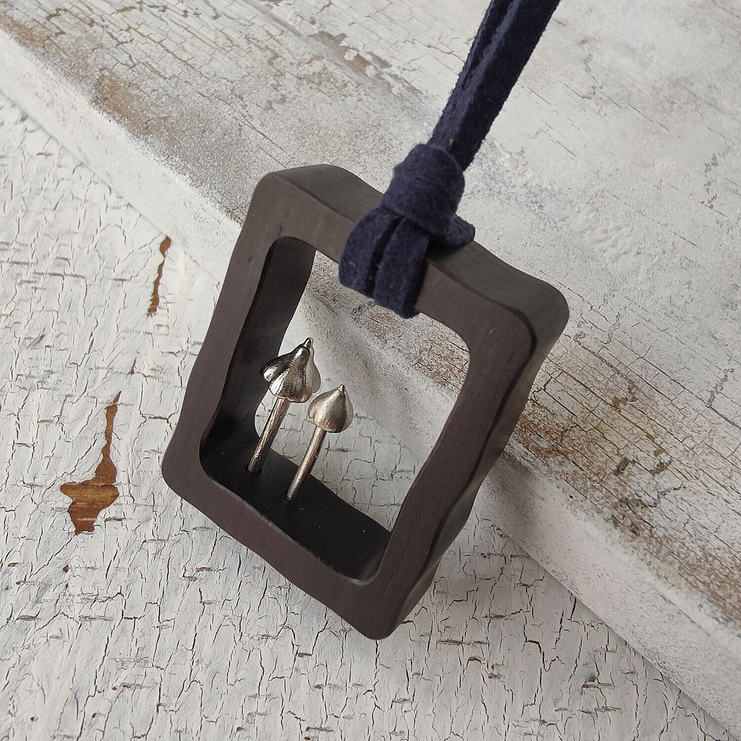 あまり見かけない長方形のペンダントですが、このシリーズの中では1番人気です。暗めの色の服に着けると中のきのこが引き立ちます。
